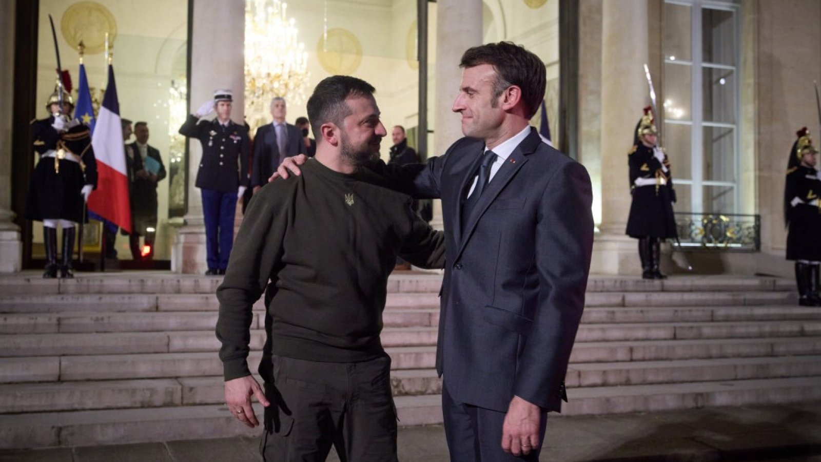 Плановете на Еманюел Макрон за вечерта на 8 февруари са били да отиде на театър, но се провалят, когато съветниците му на пожар решават да поканят украинския лидер, виждайки обръщението му пред британския парламент и политици. Речта на Зеленски с препратки към историята и Уинстън Чърчил, както и фразата "Имаме свободата, дайте ни криле, за да я защитим" в Уестминстърското абатство беше оценена много високо от политически анализатори