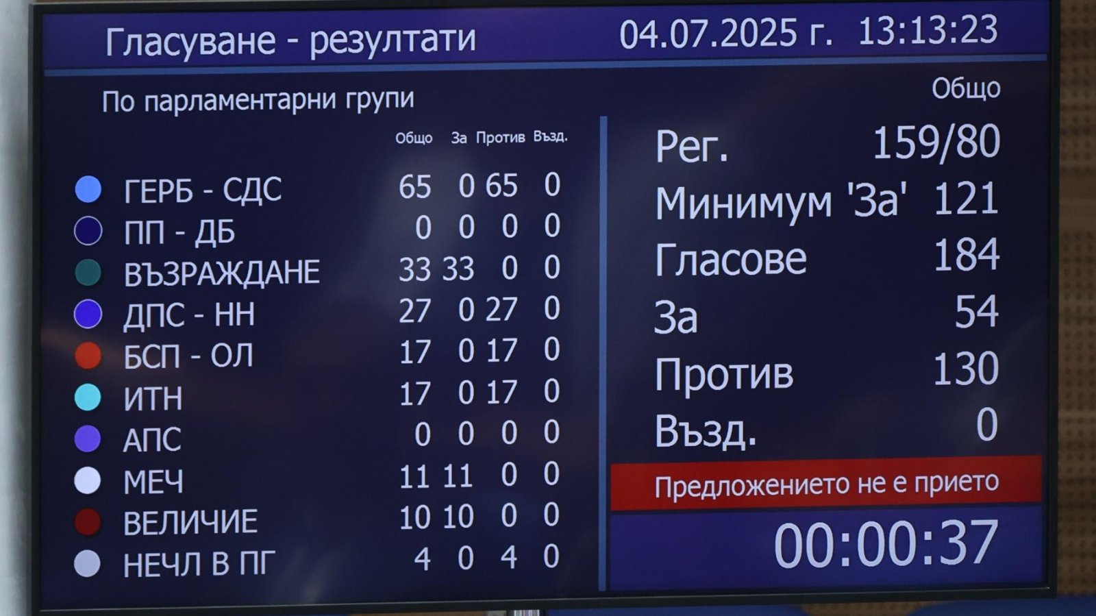 Парламентът отхвърли вота на недоверие към правителството на премиера Росен Желязков за "провал в сферата на фискалната политика" с 54 гласа "за" и 130 "против", предава БТА.