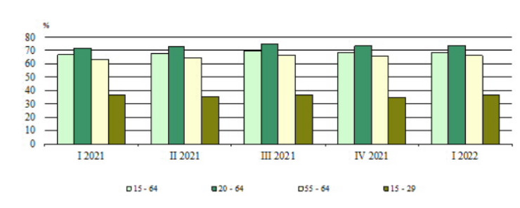 През първото тримесечие в сектора на услугите работят 1,98 милиона, или 64,6% от заетите, в индустрията – 906 хил. (29,5%), и 178 хил. (5.8%) - в селското, горското и рибното стопанство. В сравнение със същото тримесечие на 2021 г. броят на заетите се увеличава в сектора на услугите с 94,9 хил. (5,0%), намалява в сектора на индустрията с 55,5 хил. (5,8%) и остава почти непроменен в сектора на селското, горското и рибното стопанство.