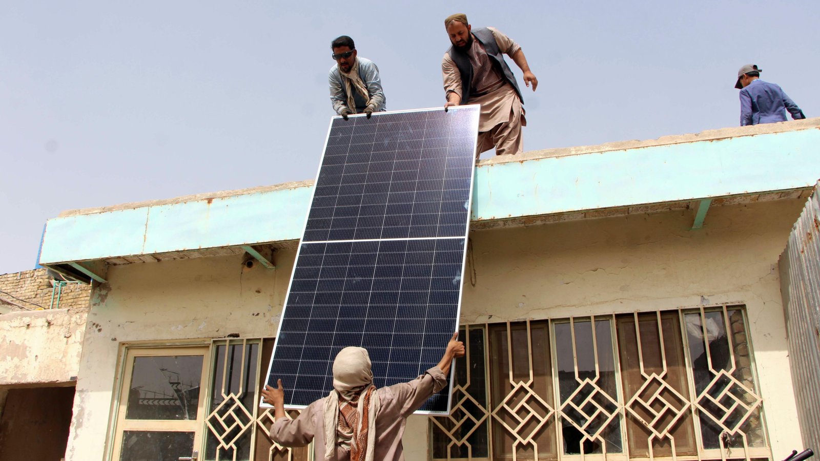 Работници инсталират соларни панели върху покрива на сграда в Кандахар, Афганистан. Все повече афганистанци разчитат на соларната енергия като по-надежден и ефективен източник на енергия.