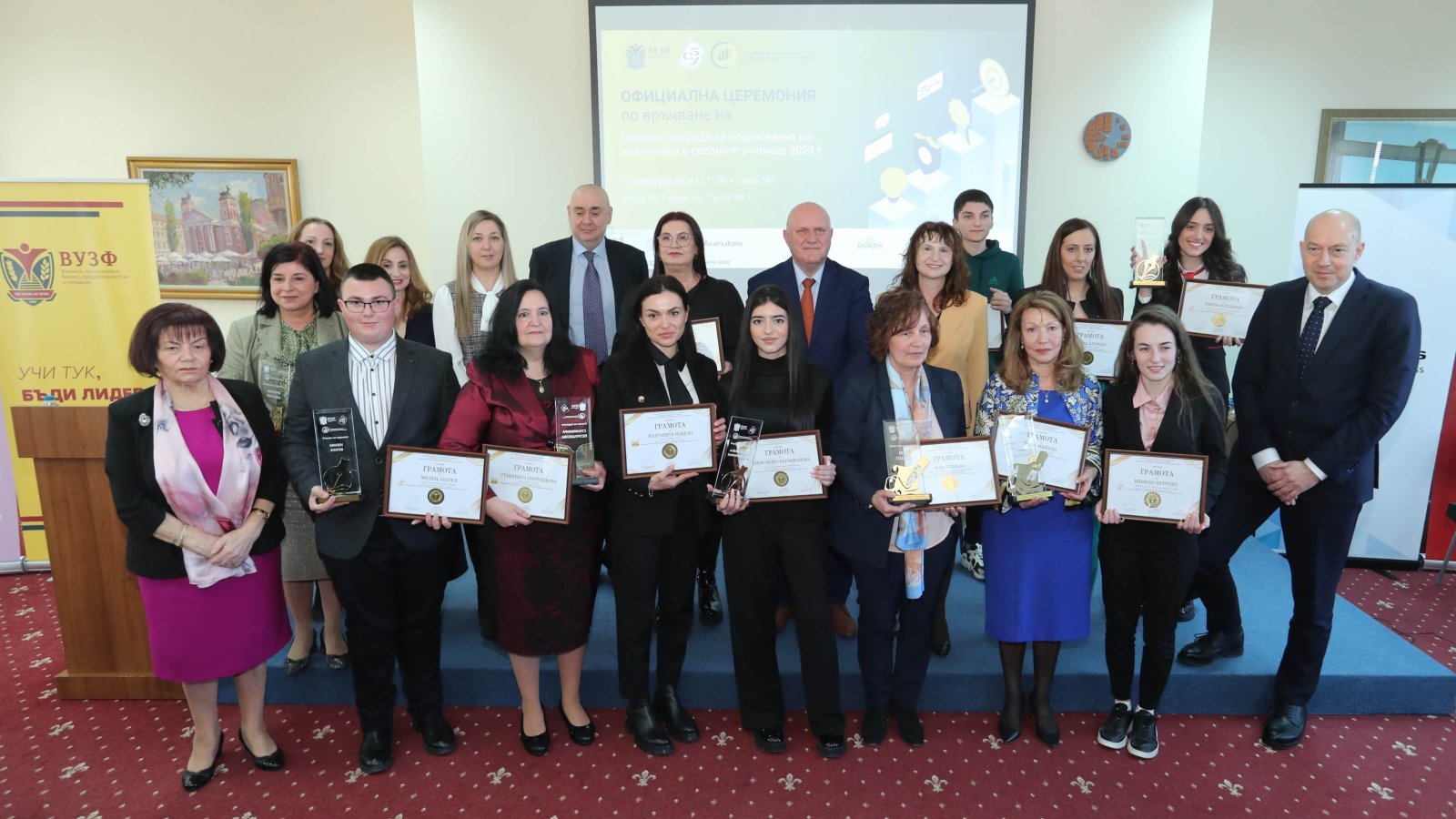 На 15 февруари в зала 501 на Висшето училище по застраховане и финанси (ВУЗФ) в гр. София се състоя първата церемония по връчване на годишните награди от Националния конкурс за образование по икономика в средните училища за 2023 г., организиран от Висшето училище по застраховане и финанси (ВУЗФ), Синдиката на българските учители (СБУ) и Националната асоциация на преподавателите по икономика (НАПИ).