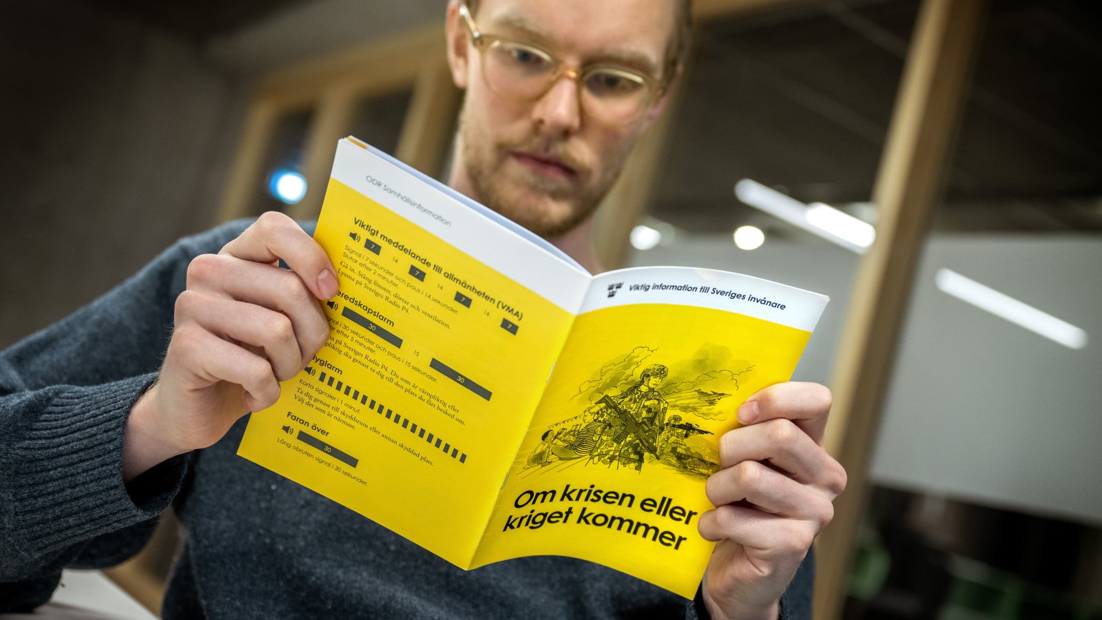 Мъж позира с брошурата „Ако настъпи криза или война“ за 2024 г. в Стокхолм в Швеция. Брошурата има за цел да подготви населението в случаи на война и извънредни ситуации като природни бедствия кибер атаки и терористични нападения. Шведската агенция за извънредни ситуации я разпраща на всички домакинства в страната на 18 ноември.