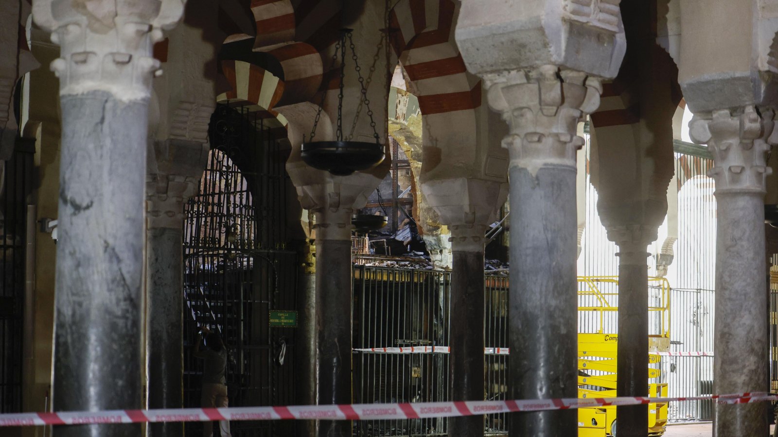 Щети след избухналия снощи пожар в преустроената в християнска катедрала джамия в град Кордоба, Испания. Огънят причини срутване на покрива и други части на историческата сграда, която сега е в процес на реставрация.