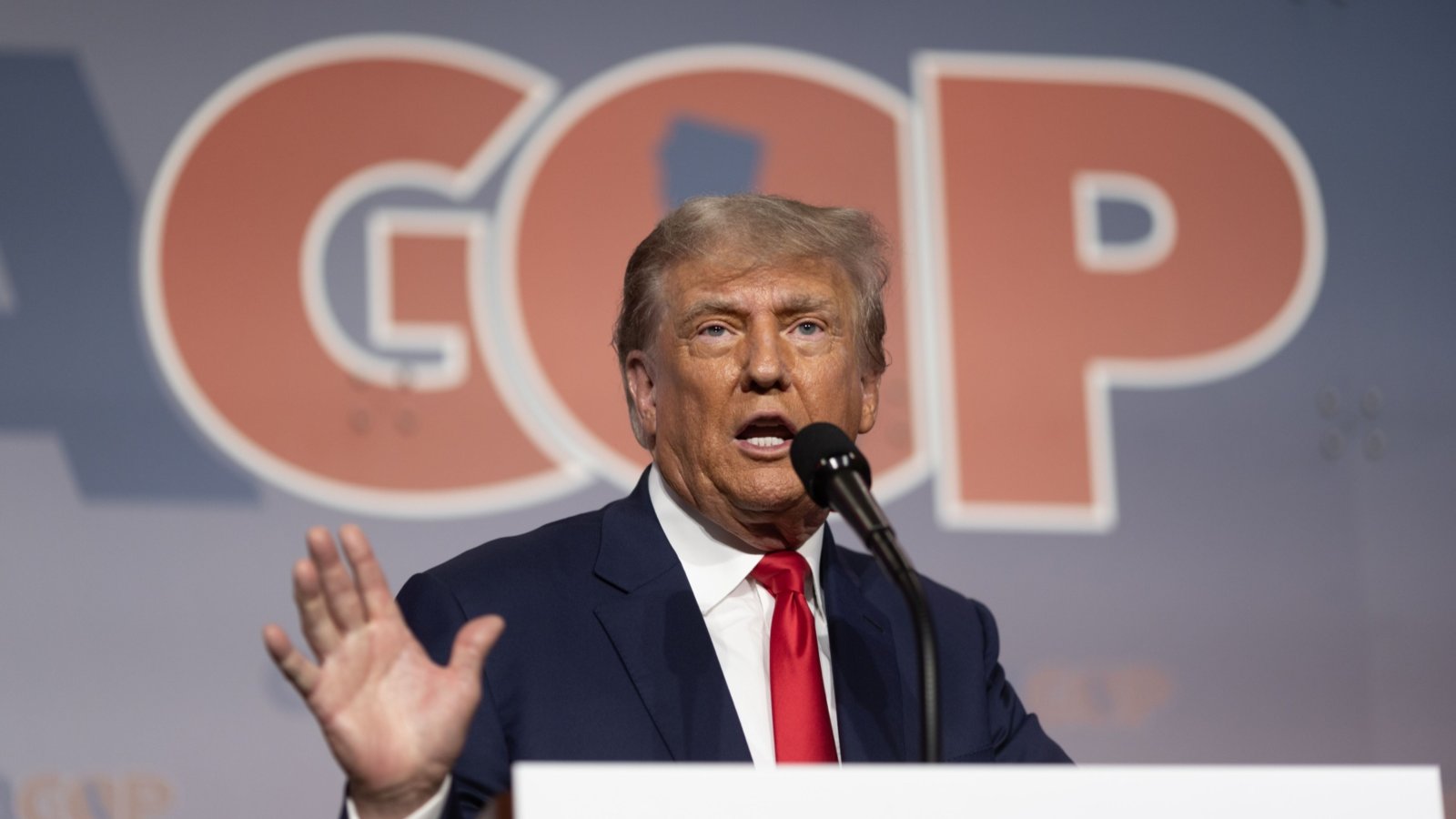 Тръмп беше облечен с тъмносин костюм, по-светлосиня вратовръзка и американското знаме, забодено на ревера му. Той отново нарече Джеймс, която е чернокожа, „расистка“ и заяви, че демократката иска вендета срещу него.