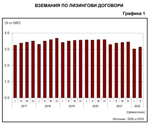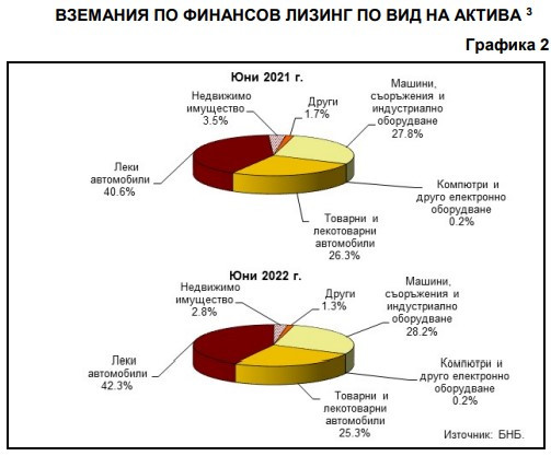 В БНБ отчитат, че вземанията по договори за финансов лизинг на Леки автомобили са 1,952 млрд. лв. в края на юни 2022 година. Те нарастват с 12,6% (218,3 млн. лв.) на годишна база и с 3,7% (68,8 млн. лв.) в сравнение с края на първото тримесечие на 2022 година. Относителният им дял е 42,3% в края на юни 2022 г. при 40,6% в края на юни 2021 година.