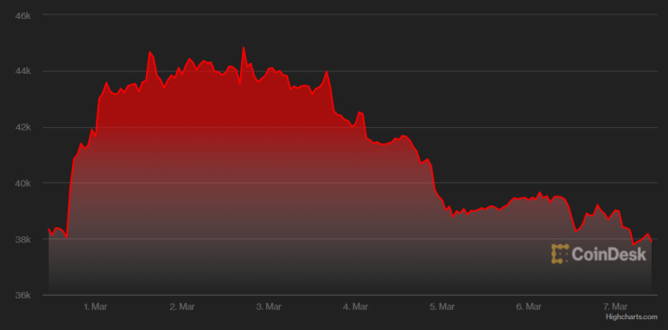 Цената на биткойна спадна под 38 хил. долара в понеделник на фона на продължаващите страхове за развитието на войната в Украйна и главоломно растящите цени на суровините, които се отразиха на целия по-широк пазар, съобщава Bloomberg.