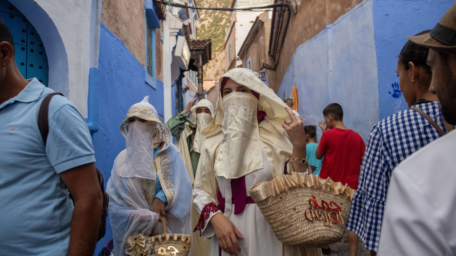 Булка и нейни приятелки, облечени в традиционни марокански одежди, вървят по улица в Шефшауен.