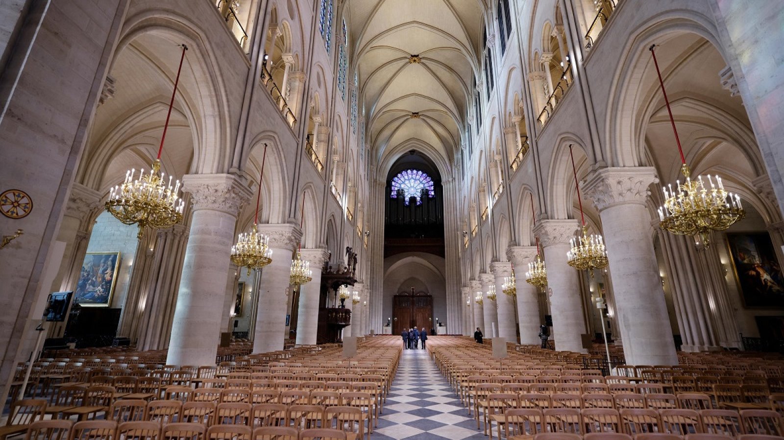 Много парижани се втурнаха към катедралата, а телевизионните зрители по целия свят гледаха ужасени вечерта на 15 април 2019 г., когато шпилът и покривът се срутиха при пожар, който застрашаваше камбанариите и цялата сграда, която едва не рухна. „Планетата беше разтърсена в този ден“, каза Макрон преди днешното събитие. „Вярвам, че шокът от откриването ще бъде толкова силен, колкото и този от пожара, но ще бъде шок на надеждата.“