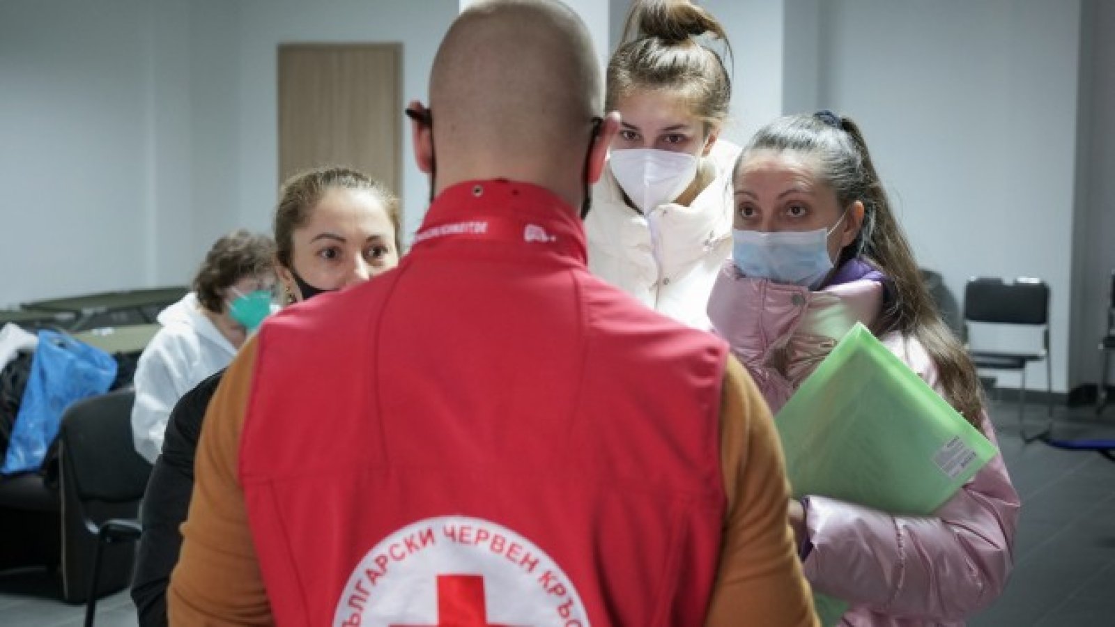 Доброволец на Българския червен кръст (БЧК) във временния център за подкрепа на бежанци от Украйна в Централна гара - София.