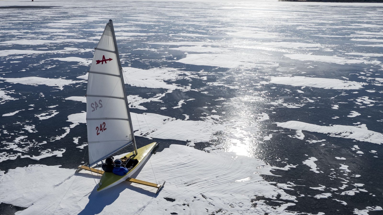 На снимка, направена с дрон, платноходка плава в заледено езеро в Брукфийлд, щата Масачузетс, в САЩ. Ледът в езерото е дебел над 15 см, а поривите на вятъра достигат 40 км/ч.