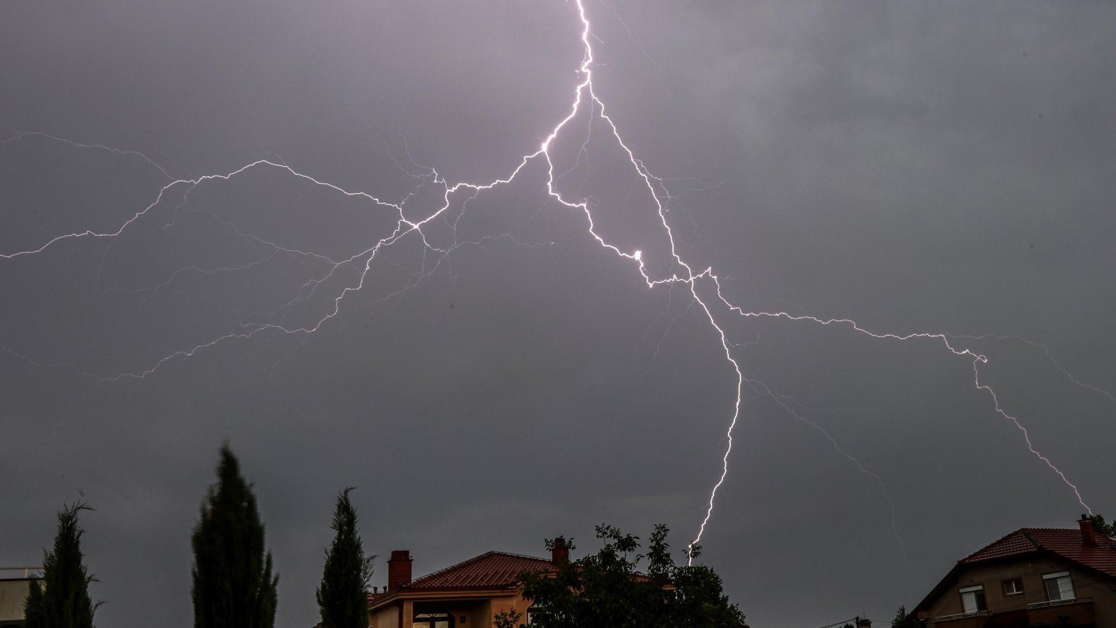 Светкавица проблясва в небето при гръмотевична буря в Скопие, Македония.