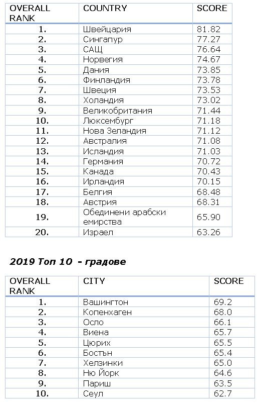 Лидери в класацията за 2019 г. са Швейцария, Сингапур и САЩ.