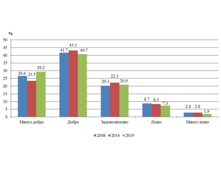 Над 40% от българите определят здравето си като „добро“, малко над 29% - като "много добро“, а за 21% то е „задоволително“. Като „лошо“ и „много лошо“ оценяват здравословния си статус съответно 7,3% и 1,9%.