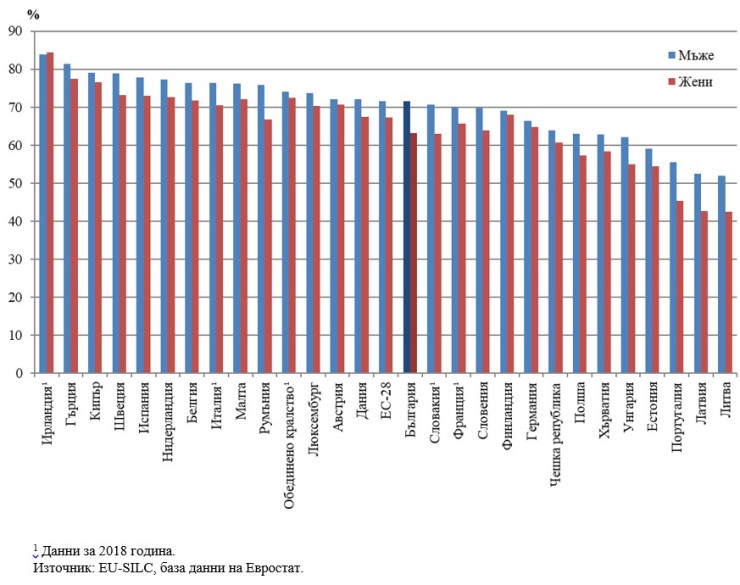 Относителен дял на лицата на възраст 16 и повече години в държавите от ЕС, определили здравето си като „много добро“ и „добро“ през 2019 г. по пол