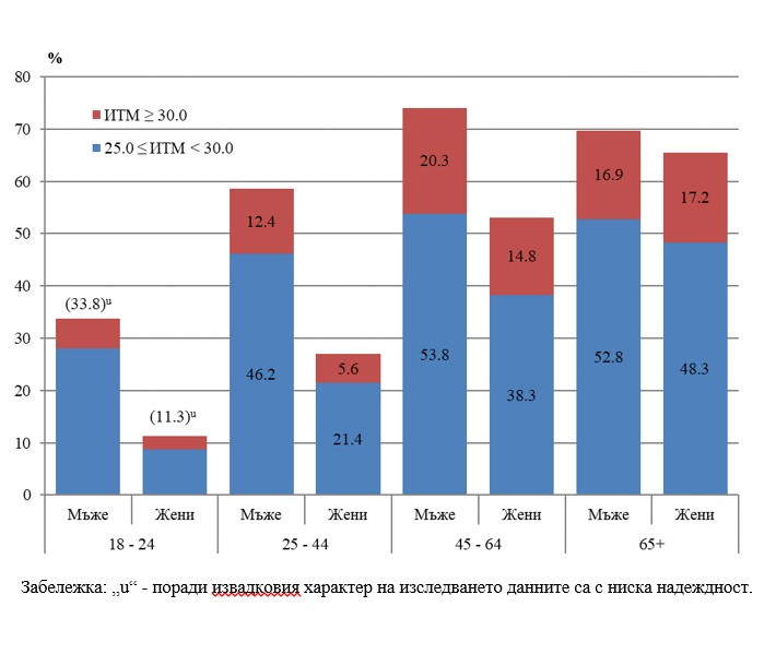 С увеличаване на възрастта намалява разликата между двата пола и при най-възрастното население на 65 и повече години разликата в относителните дялове на лицата с наднормено тегло е минимална (69,7% от мъжете и 65,5% от жените).