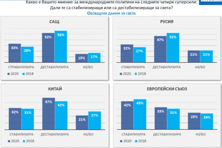Русия, макар и да е приемана като първа световна суперсила у нас, не е считана за стабилизиращ фактор със същата убеденост. Макар и да не е така силно изразено, обаче мнозинството у нас смята, че политиките на Русия по-скоро стабилизират света (42%). Една четвърт не са съгласни, а една трета не могат да преценят.
