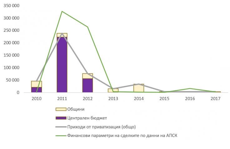 Бележка: 1. Данните за общините, за централния бюджет и общо приходи от приватизация представляват касовите годишни приходи от приватизация, включени в консолидираната фискална програма. Данните за финансовите параметри на сделките по данни на АСПК включват договорените плащания, поетите задължения, изплатени задължения и договорени инвестиции. 2. През 2011 г. и отчасти през 2012 г. ръстът в приходите се дължи на приватизационните сделки за „Булгартабак“ и продажбата на дялове в електроразпределителните дружества ЧЕЗ, ЕВН и Енерго–про.