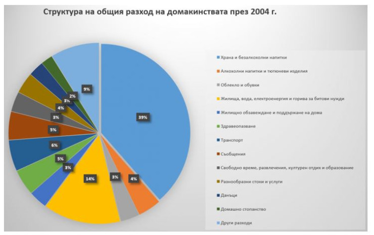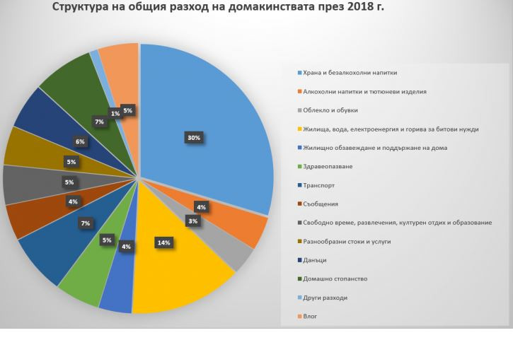 2/ делът на храните и безалкохолните напитки в общия бюджет на домакинствата намалява от 39,3% през 2004 г. до 29,7% през 2018 г., т.е. с близо 10 процентни пункта, като за първи път през 2018 г. той минава под 30%-ата граница. Делът на тези разходи традиционно се използва като показател за стандарта на живот и благосъстоянието, тъй като разходите за храна са от първа необходимост и не могат да бъдат отложени във времето или спестени – колкото по-висок е този дял, толкова стандартът на живот е по-нисък. Все пак, въпреки трайната тенденция на подобрение, България все още е далеч от развитите страни в Западна Европа, където този дял е над 2 пъти по-нисък, отколкото в България.