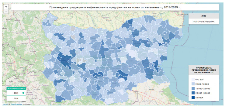 Картата с данните за произведената продукция на човек от населението е интересна, тъй като отнема естественото предимство на големите общини и показва по-разнообразна картина. Претегляйки продукцията спрямо населението, се вижда, че Столична община (56 хил. лв. продукция на човек) е на 7-о място. Водачите в страната по произведената продукция на човек от населението са малки общини със силна индустриални енергетика – Гълъбово (162 хил. лв.), Девня (155 хил. лв.), Раднево (88 хил. лв.), Божурище (75 хил. лв.), Раковски (66 хил. лв.) и Марица (64 хил. лв.). Отново отчитаме, че най-вероятно малките общини с големи компании в Средногорието също биха били сред лидерите по този показател, но данните са конфиденциални.