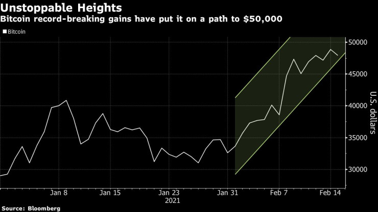 Знаците за нарастваща подкрепа от индустрията на финансовите услуги изпрати цената на биткойна до нови върхове, пише Bloomberg. Валутата почти достигна цената от 50 хил. долара, преди да отстъпи по-късно в понеделник.