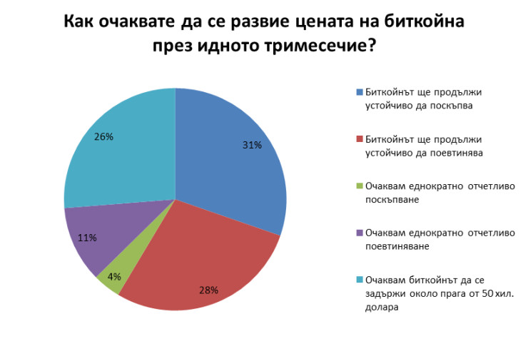 По отношение на по-скорошните прогнози за идното тримесечие читателите на Investor.bg са далеч по-скептично настроени. Почти една трета (30%) от анкетираните смятат, че биткойнът ще продължи да поскъпва устойчиво, показва анкета на сайта на Investor.bg. В същото време според 28% той ще продължи да поевтинява устойчиво. За 26% пък цената му ще продължи да гравитира около цената от 50 хил. долара.