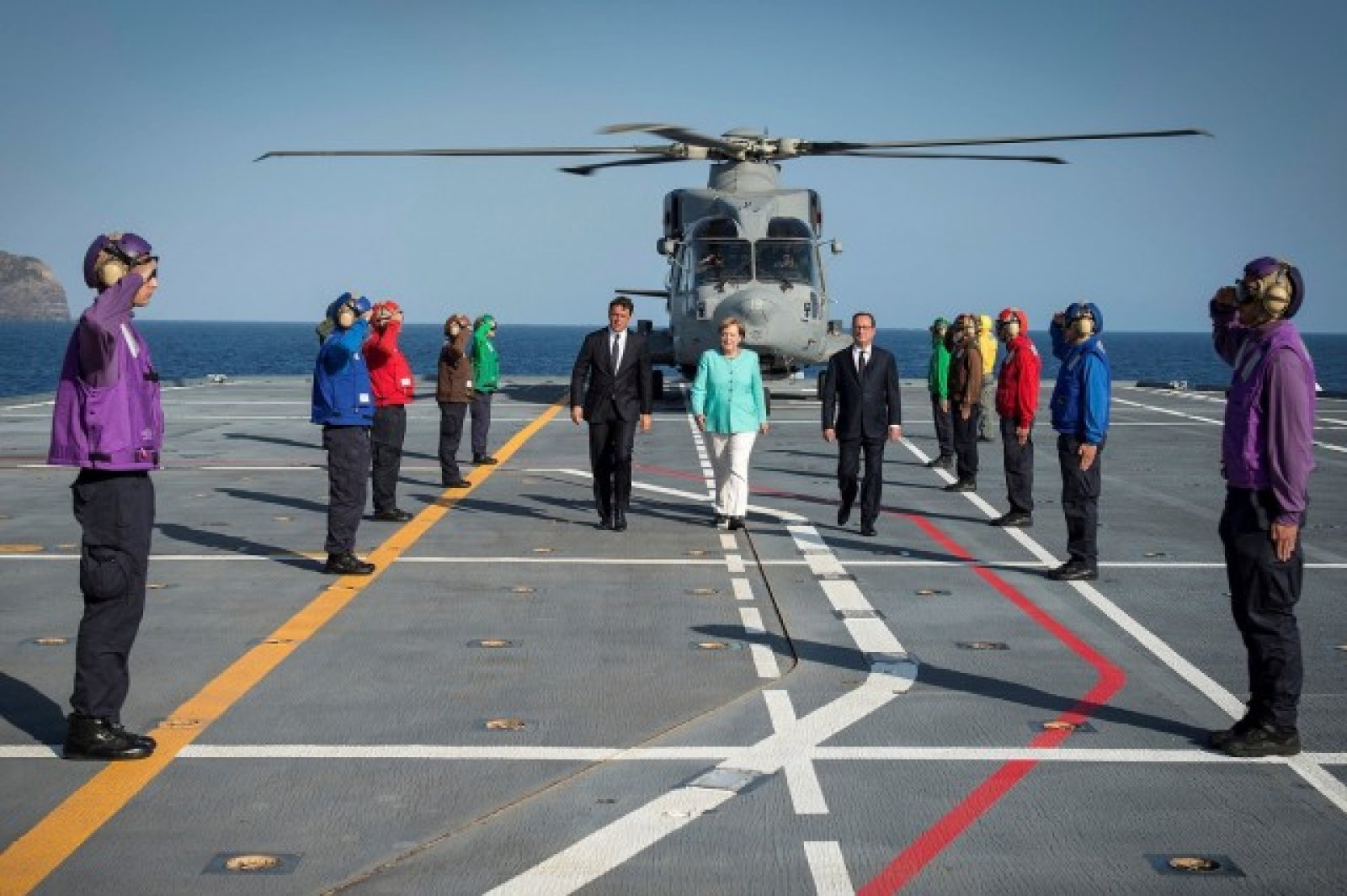 Но погледнете пак Меркел, Оланд и Ренци на борда на "Гарибалди", флагмански кораб на мисията на ЕС край бреговете на Либия, част от спасителна операция и военно средство за разубеждаване на каналджии, и пред очите ви ще се появи по-различна картина на днешния ЕС.