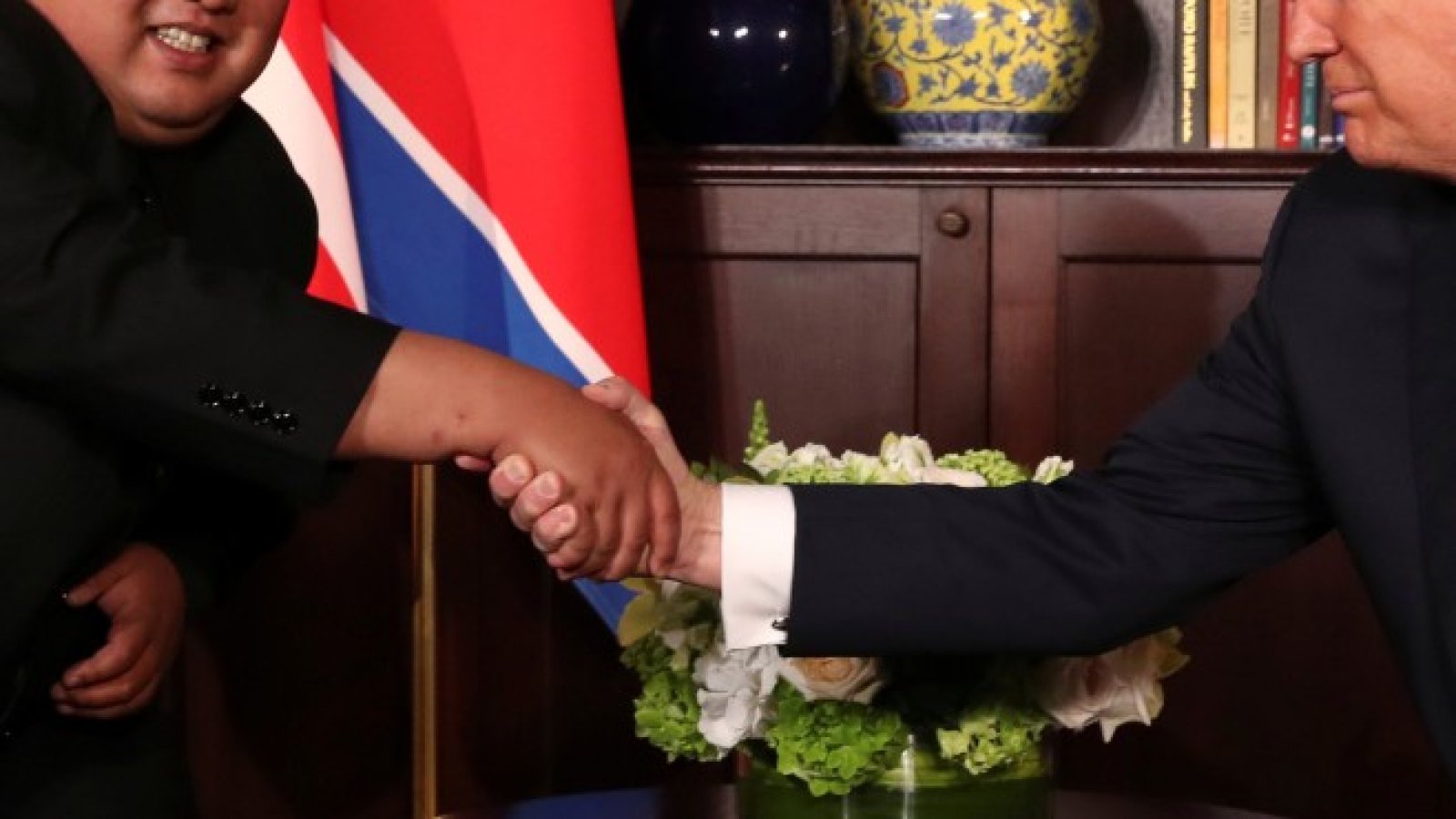 Двамата лидери си размениха няколко думи, изминавайки няколко метра заедно по червен килим пред американски и севернокорейски знамена. Това е нещо, доскоро съвсем немислимо, отбелязва AFP.