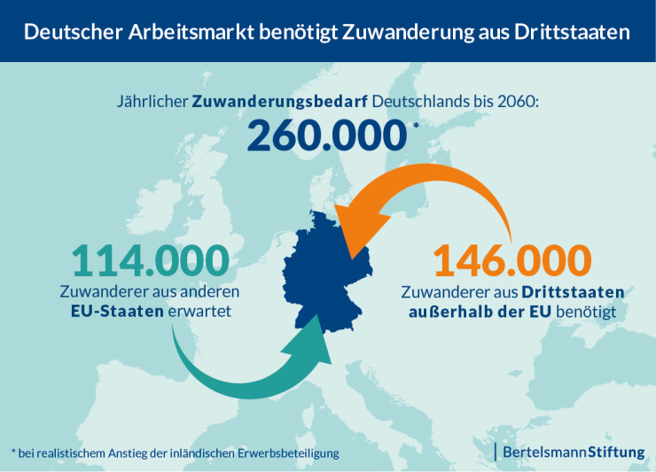 До 2060 г. Германия ще има нужда от годишна имиграция от поне 260 000 души. Само по този начин причиненият от демографията срив в предлагането на работна ръка може да бъде ограничен до ниво, приемливо за икономиката. Очаква се средногодишно около 114 000 имигранти да влязат във федералната република от други страни от ЕС, но около 146 000 души ще трябва да имигрират от трети страни извън ЕС. Това показват резултатите от изследването на Йохан Фукс и Александер Кубис от Института за изследване на заетостта (IAB) и Луц Шнайдер от университета Кобург от името на фондация Bertelsmann.
