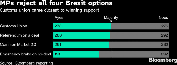 След продължили цяла вечер интензивни дебати британските депутати отхвърлиха четирите алтернативни опции на сделката за Brexit, предложени за гласуване, предаде Bloomberg.