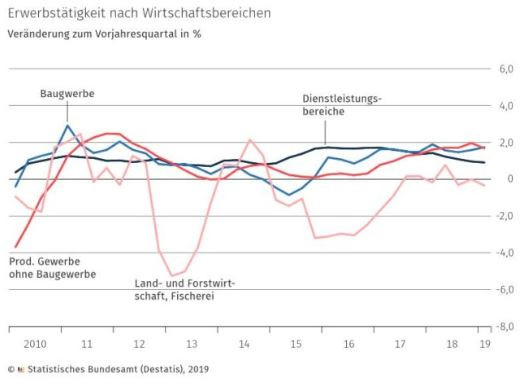 Броят на заетите лица в Германия през първото тримесечие на 2019 г. е 44,9 млн. души. Това е с 1,1% повече в сравнение със същия период на предходната година.