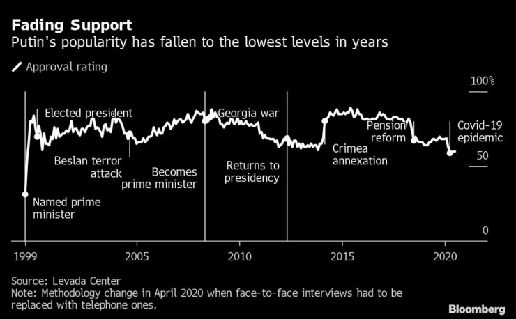 Популярността на Путин, който е на власт от 2000 г., се срина до рекордно дъно през последните седмици на фона на влошаващата се икономика заради коронавирусната пандемия и силното поевтиняване на петрола.