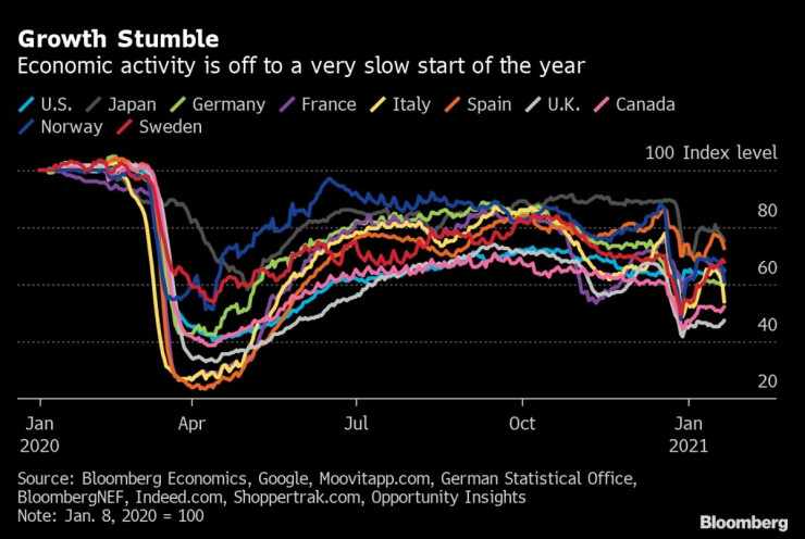 Световната икономика преживява по-трудно от очакваното начало на 2021 г. на фона на продължаващото увеличение на новите случаи на заразени с коронавирус и по-бавните темпове на ваксиниране, посочва Bloomberg в свой материал.
