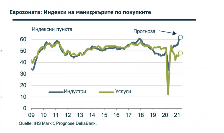 И в еврозоната също „има много доказателства, че динамиката на растежа се ускорява“, казва Едгар Уолк, главен икономист в управлението на активите на Bank Metzler. Причини за това могат да бъдат значително ускоряващите се в момента темпове на ваксинация и очакваните положителни икономически сигнали, например от индексите на мениджърите по покупки в края на седмицата.