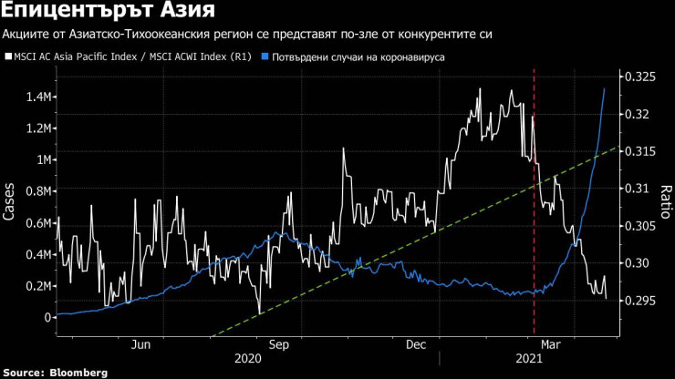 Финансовите пазари по света се подготвят за рисковете от ново разрастване на коронавируса. Азиатските пазари, ударени от нарастващите случаи на Covid -19 на различни места - от Япония до Индия, се представят по-слабо от световните си партньори от началото на март, точно във времето, в което изглеждаше, че ще се възползват от ускорението на глобалното възстановяване.