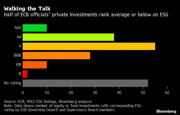 Членовете на Управителния и Надзорния съвет държат почти половината от своите частни инвестиции в активи, чиято оценка по скалата на устойчивост на MSCI Inc. е „средна“ или „изоставаща“, показва проверка на Bloomberg на базата на публично достъпни данъчни декларации.