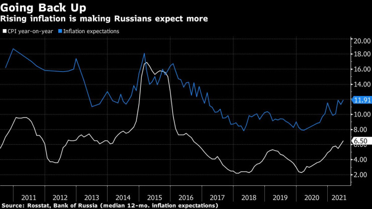 През по-голяма част от трите десетилетия след падането на комунизма руснаците трябва да свикват с увеличаващите се цени, пазейки все още спомени за хиперинфлацията през 90-те. Единствено постоянният натиск на Руската централна банка през последните пет години към целевата инфлация сви годишния темп до долния край на едноцифрения диапазон. Той дори бе под целта на централната банка от 4% през по-голямата част от миналата година.