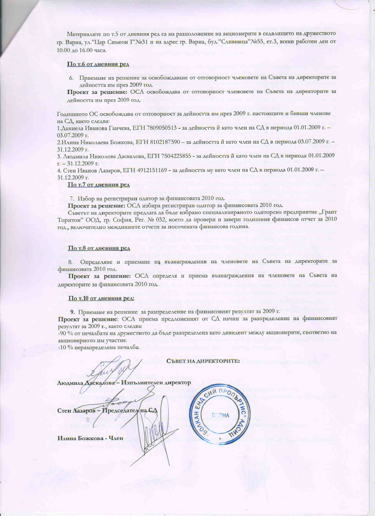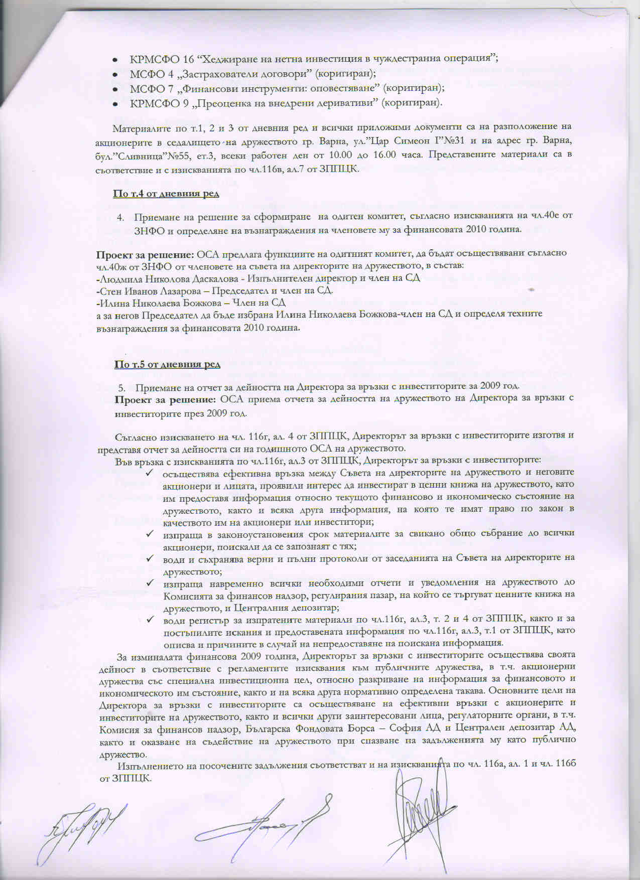 • декларация на отговорните лица към отчета за първо тримесечие 2010