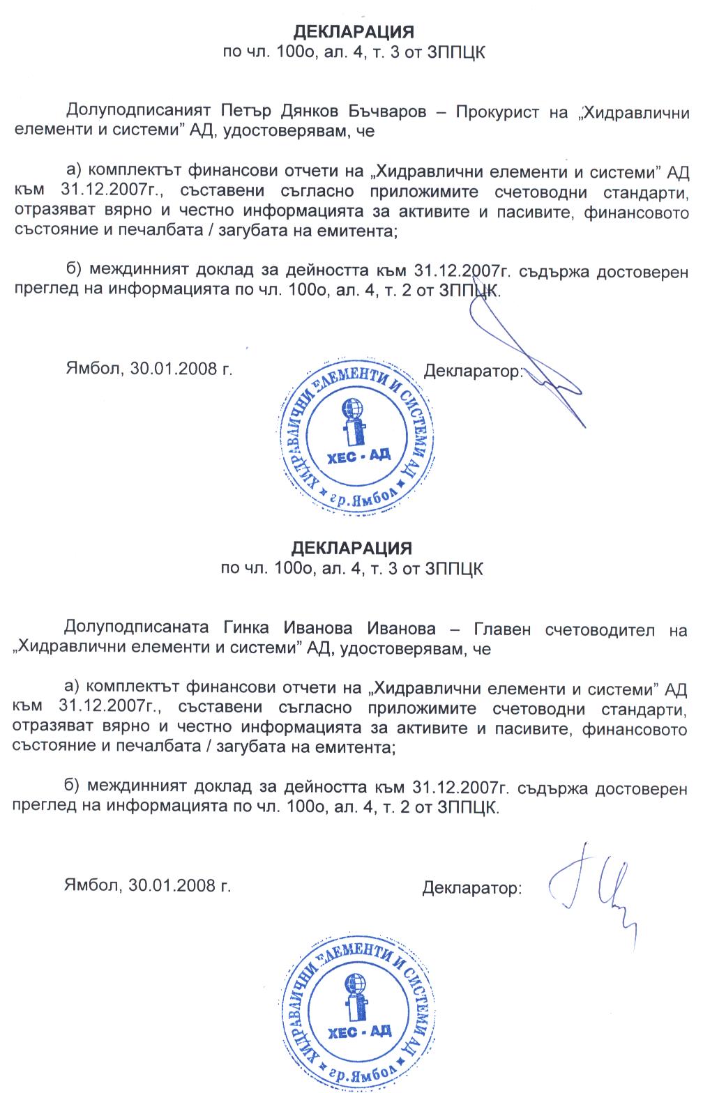 • ХЕС АД Декларации към Тримесечен финансов отчет към 31.12.2007