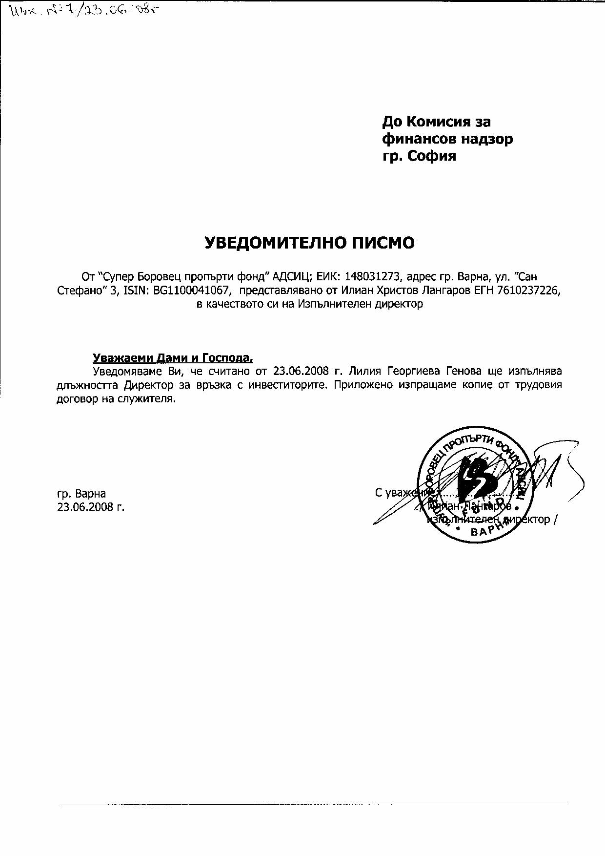 • Уведомление за назначаване на Директор за връзка с инвеститорите