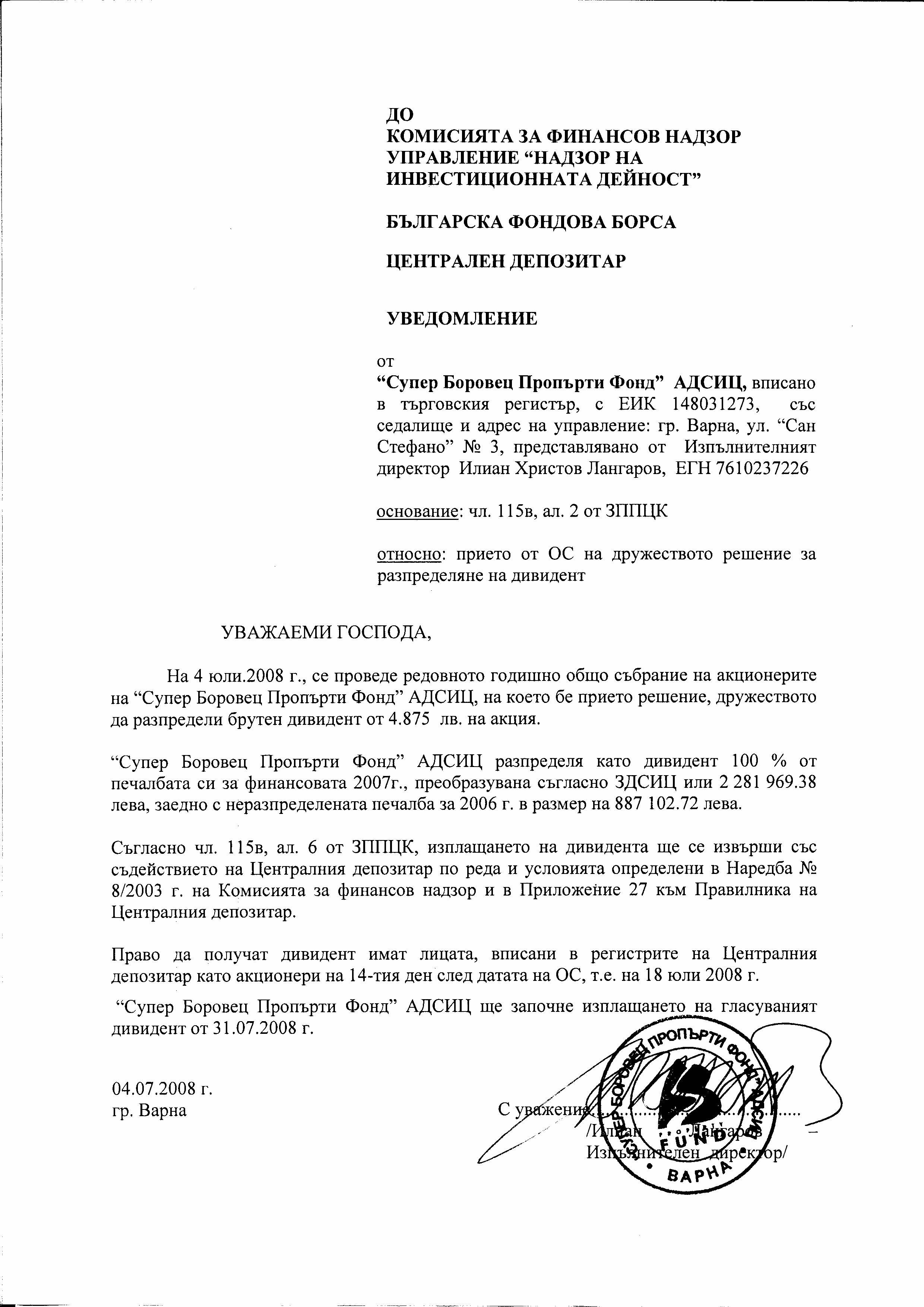 • Уведомление за разпределяне на дивидент